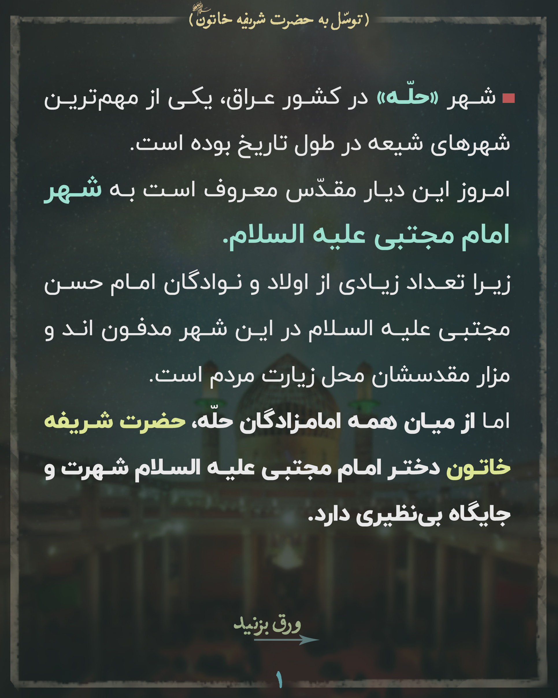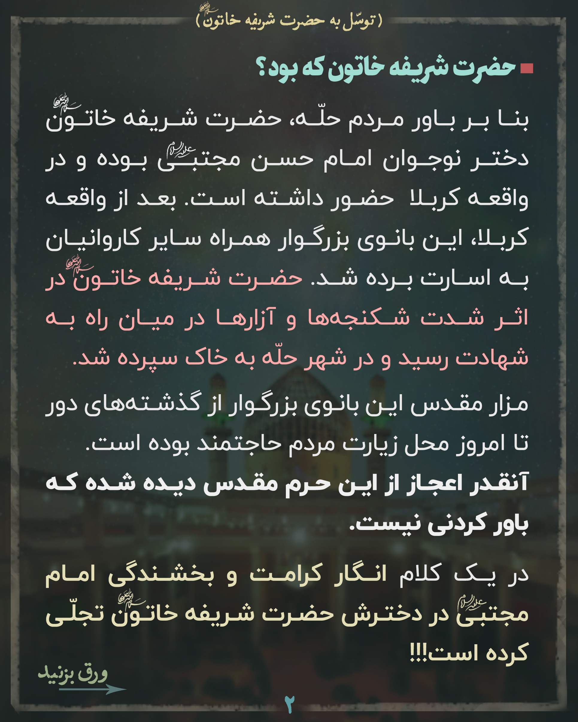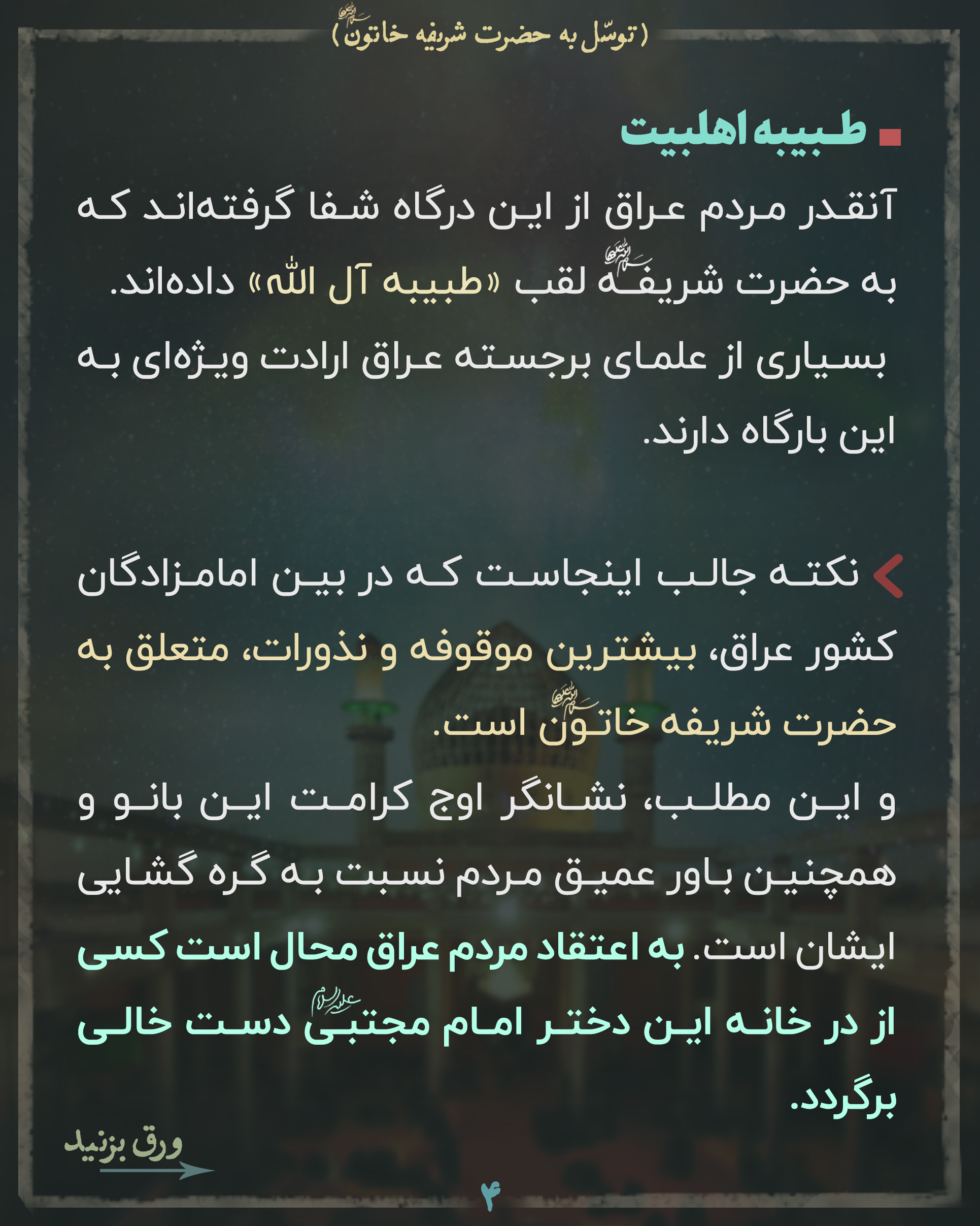 مردم عراق از این درگاه آنقدر شفا گرفتهاند که به حضرت شریفه لقب «طبیبه آل الله» دادهاند. 🍀