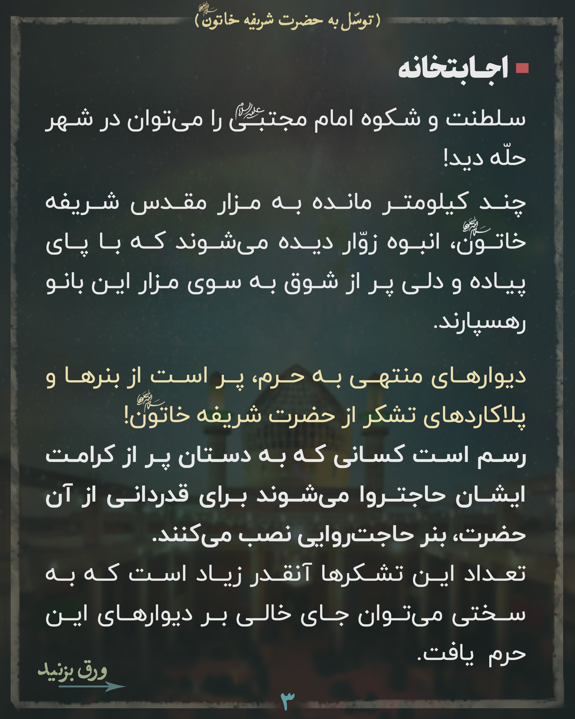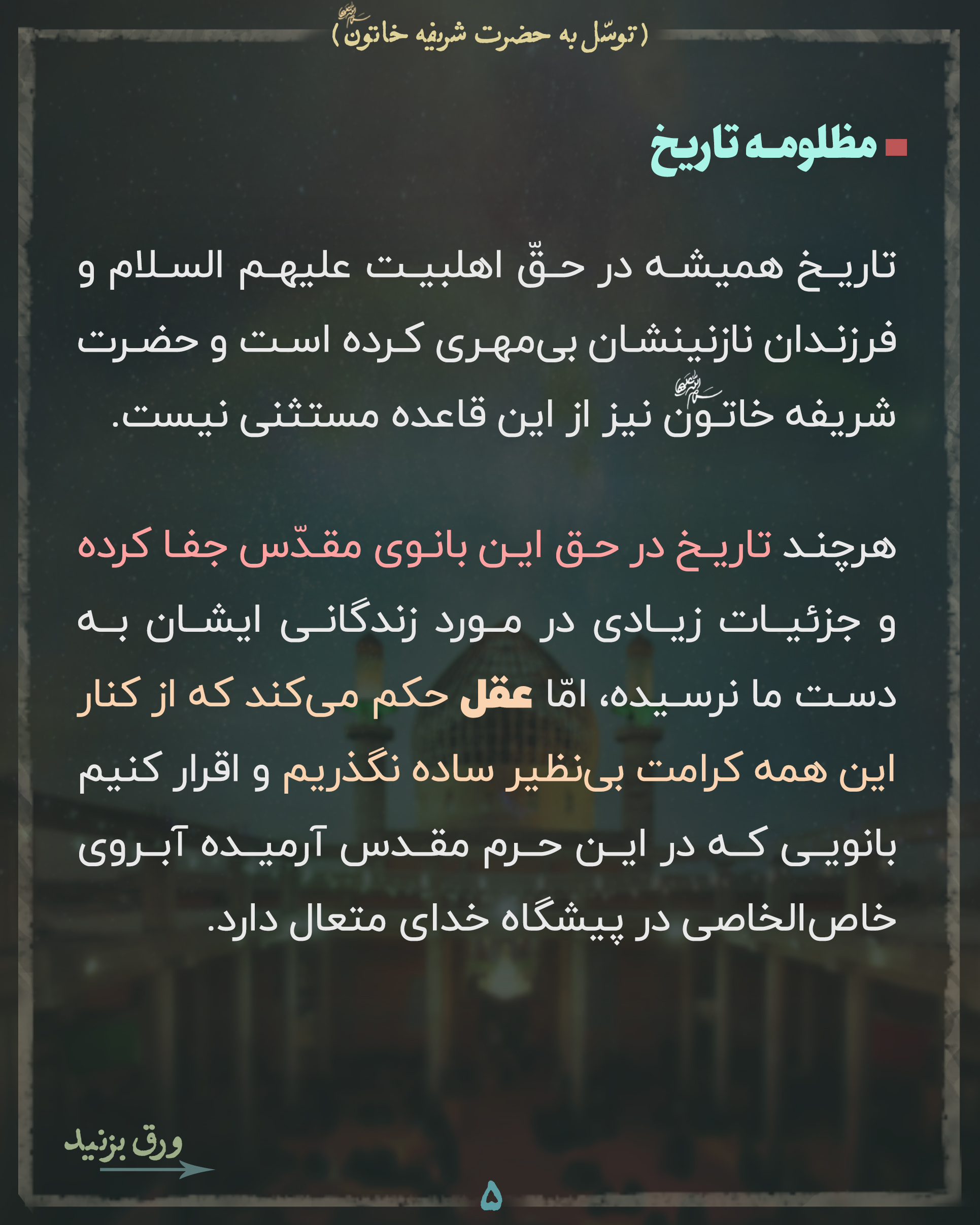 📚 هرچند تاریخ در حق این بانوی مقدّس جفا کرده و جزئیات زیادی در مورد زندگانی ایشان به دست ما نرسیده، اما عقل حکم میکند که از کنار این همه کرامت بینظیر ساده نگذریم و اقرار کنیم بانویی که در این حرم مقدس آرمیده آبروی خاصالخاصی در پیشگاه خدای متعال دارد.