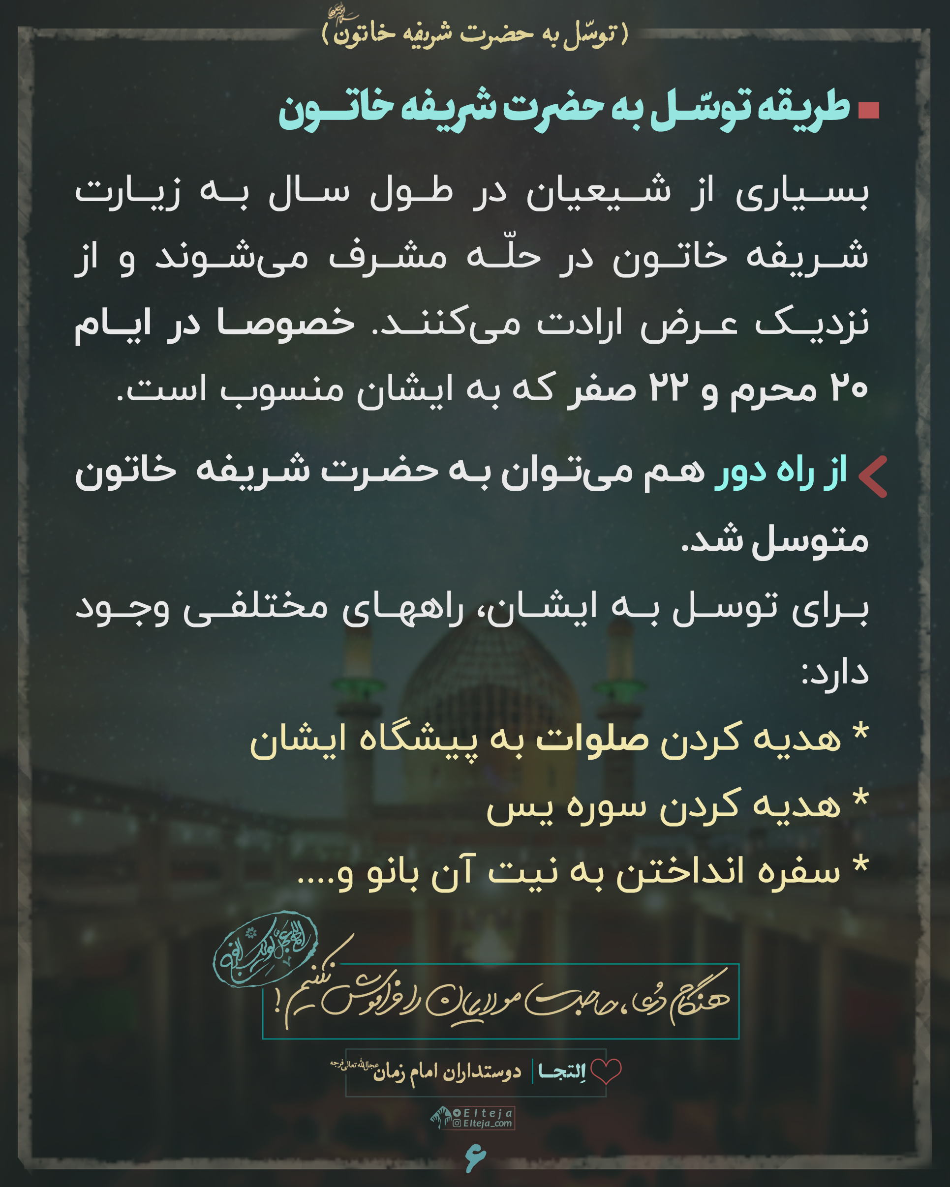 از راه دور هم میتوان (با هدیه کردن صلوات و قرآن و ….) به حضرت شریفه خاتون سلام الله علیها متوسل شد.