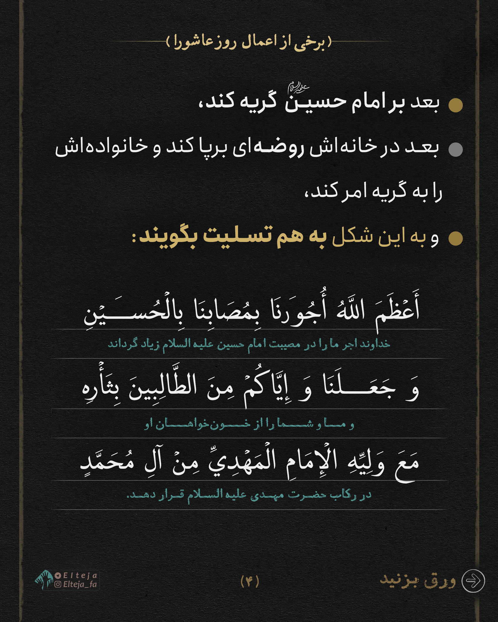 أَعْظَمَ اللَّهُ أُجُورَنَا بِمُصَابِنَا بِالْحُسَيْنِ وَ جَعَلَنَا وَ إِيَّاكُمْ مِنَ الطَّالِبِينَ بِثَأْرِهِ مَعَ وَلِيِّهِ الْإِمَامِ الْمَهْدِيِّ مِنْ آلِ مُحَمَّدٍ
