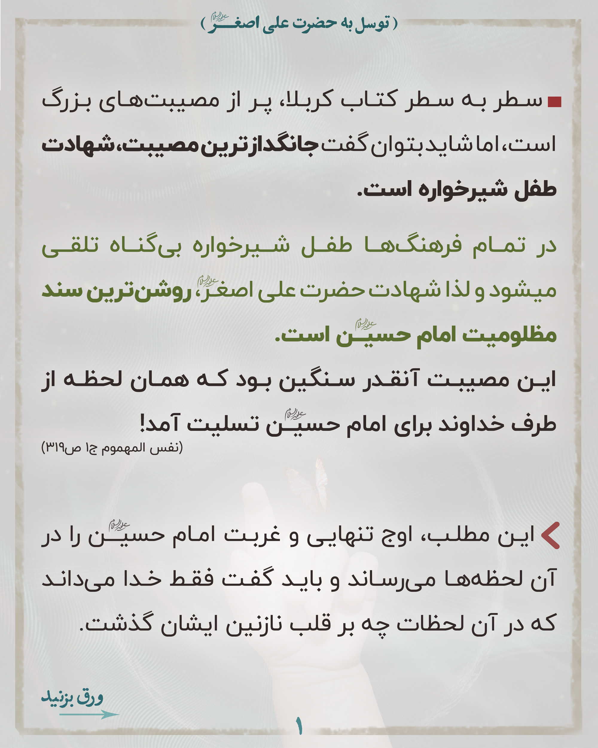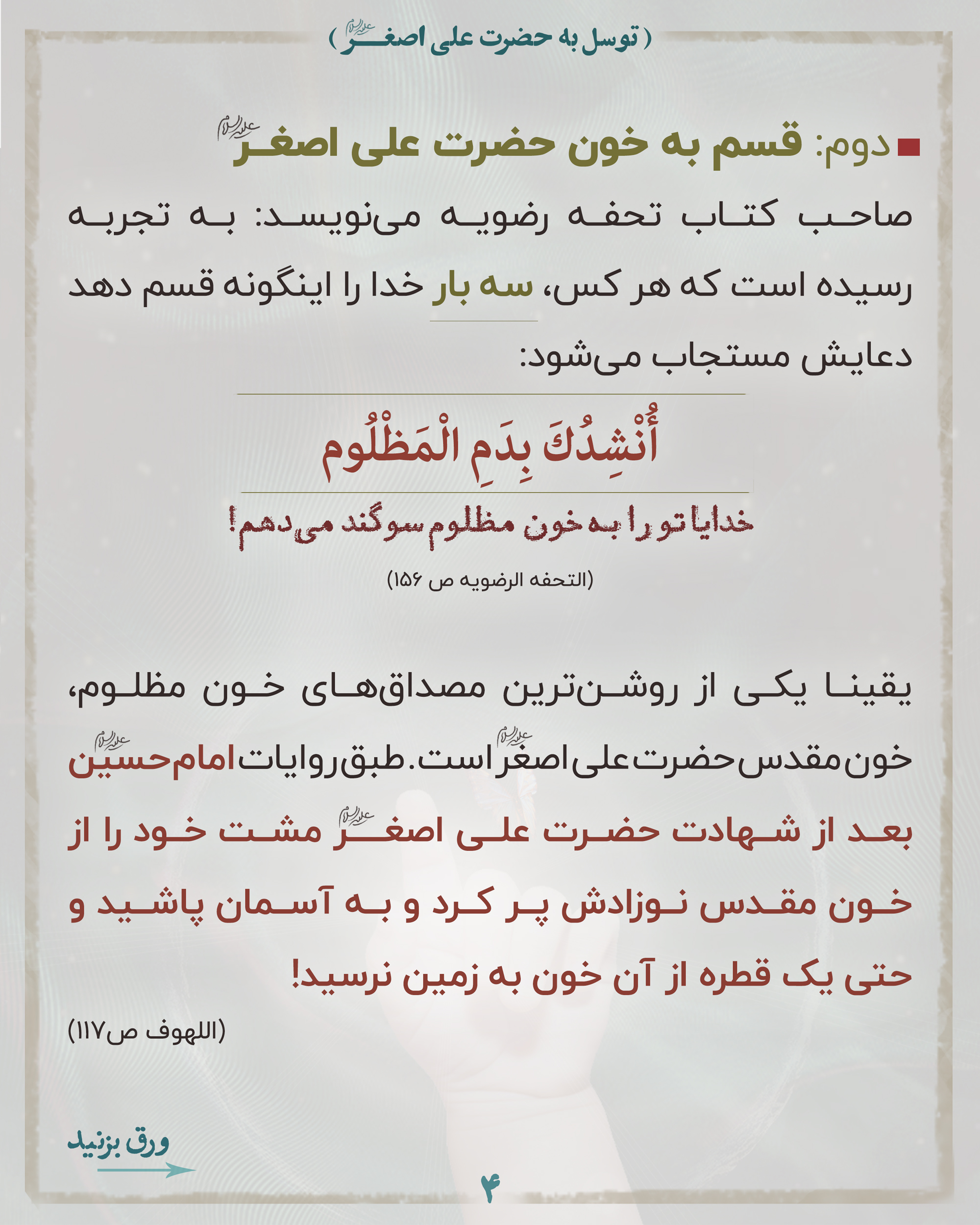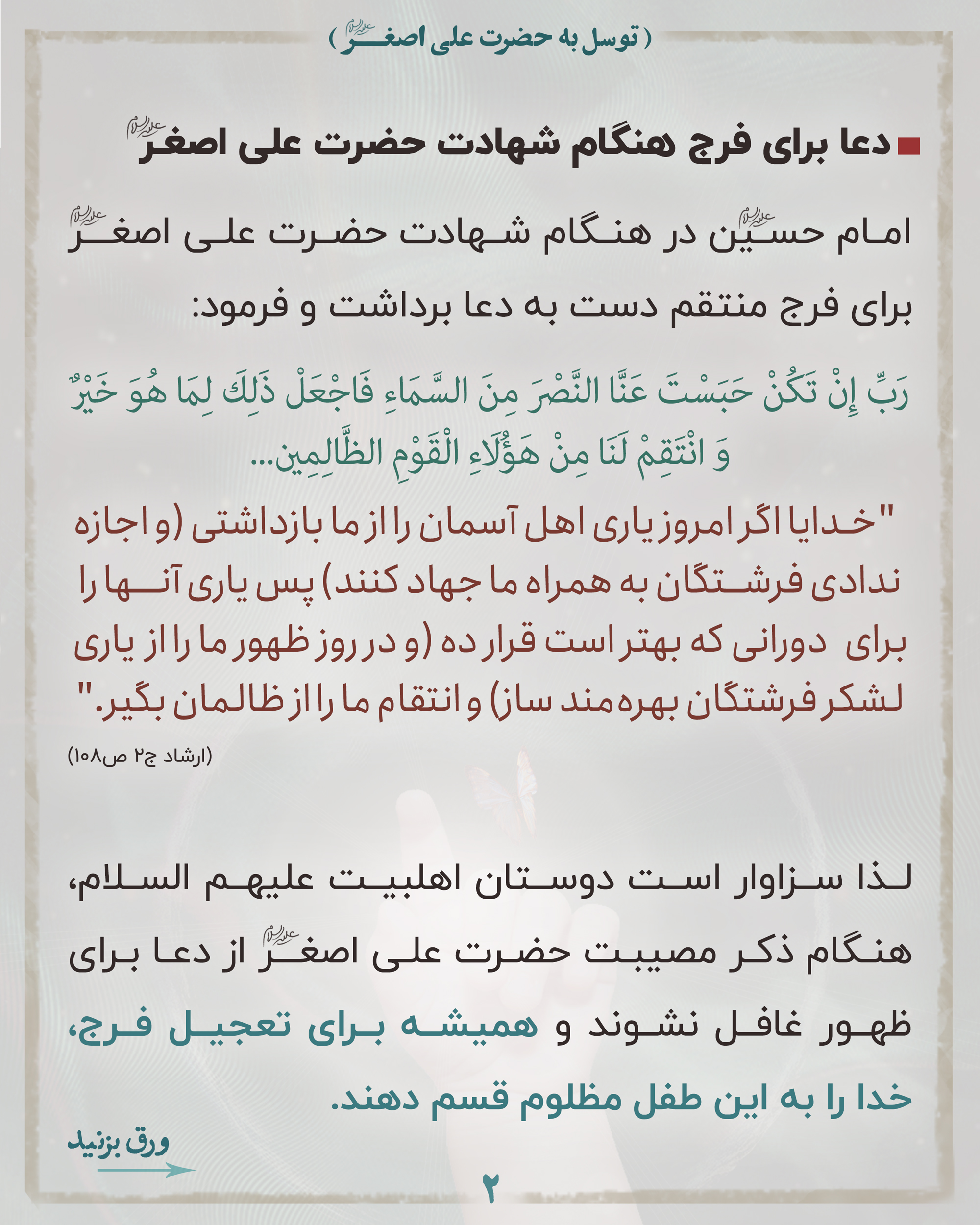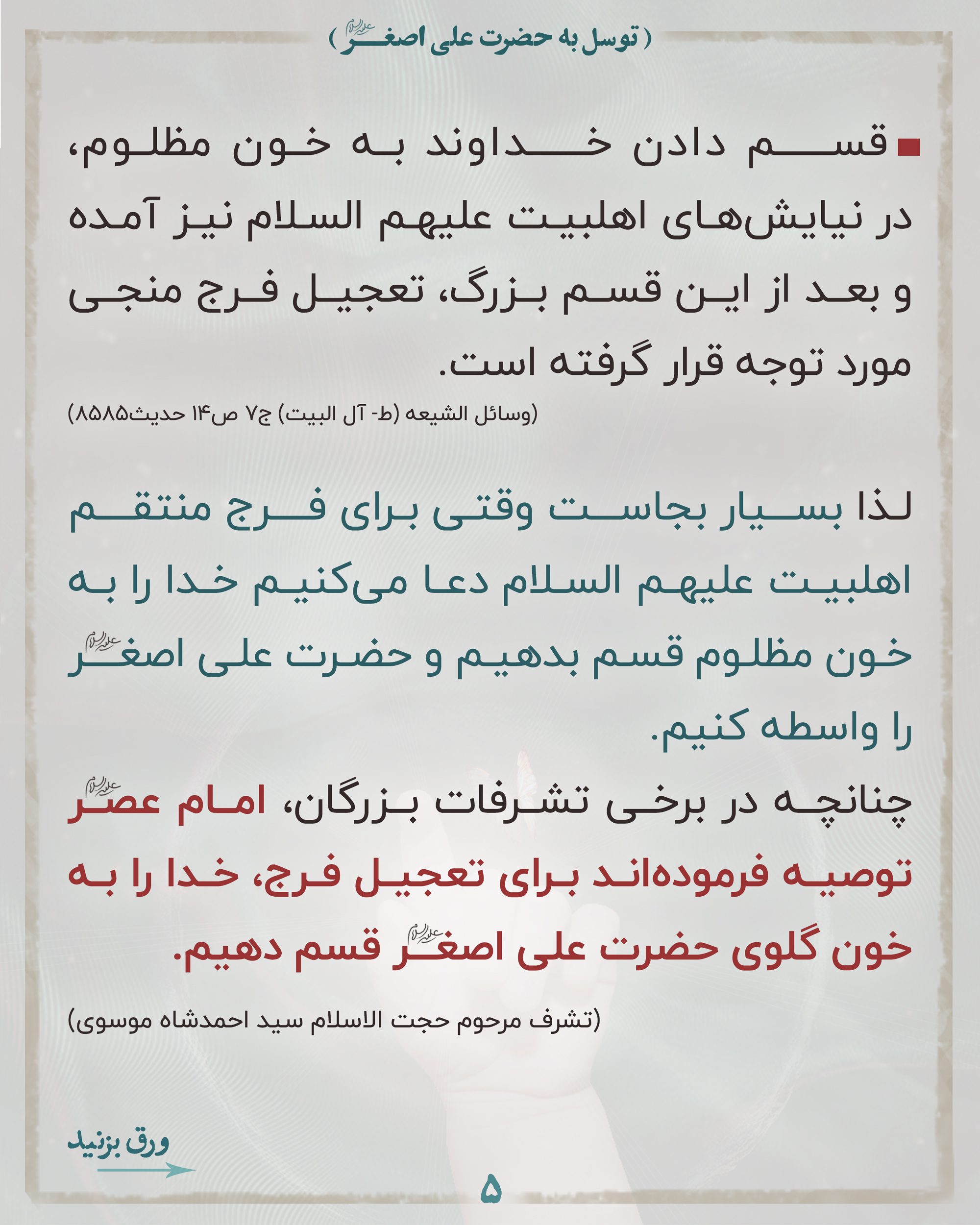 📌لذا بسیار بجاست وقتی برای فرج منتقم اهلبیت علیهم السلام دعا میکنیم خدا را به خون مظلوم قسم بدهیم و حضرت علی اصغر علیه السلام را واسطه کنیم.