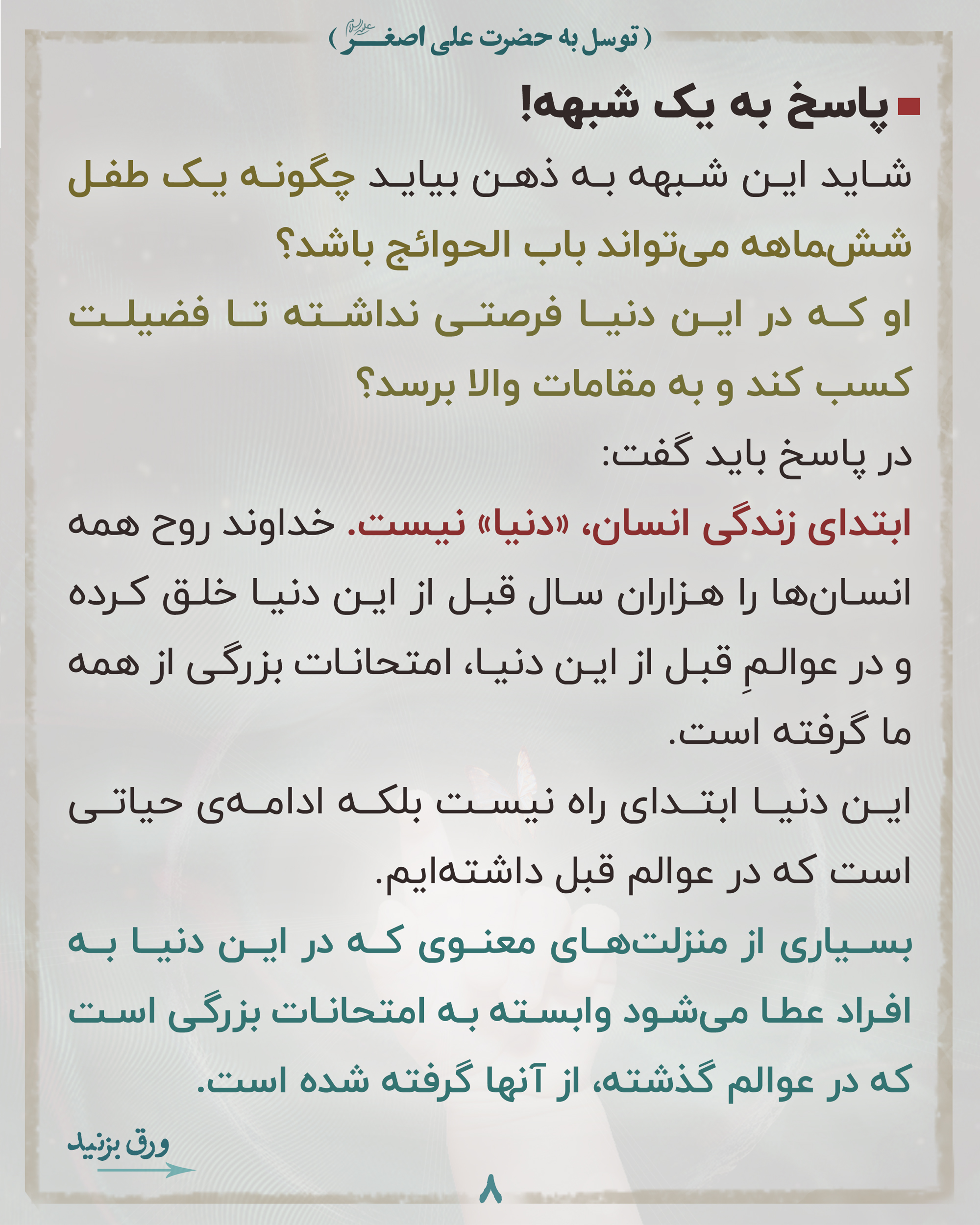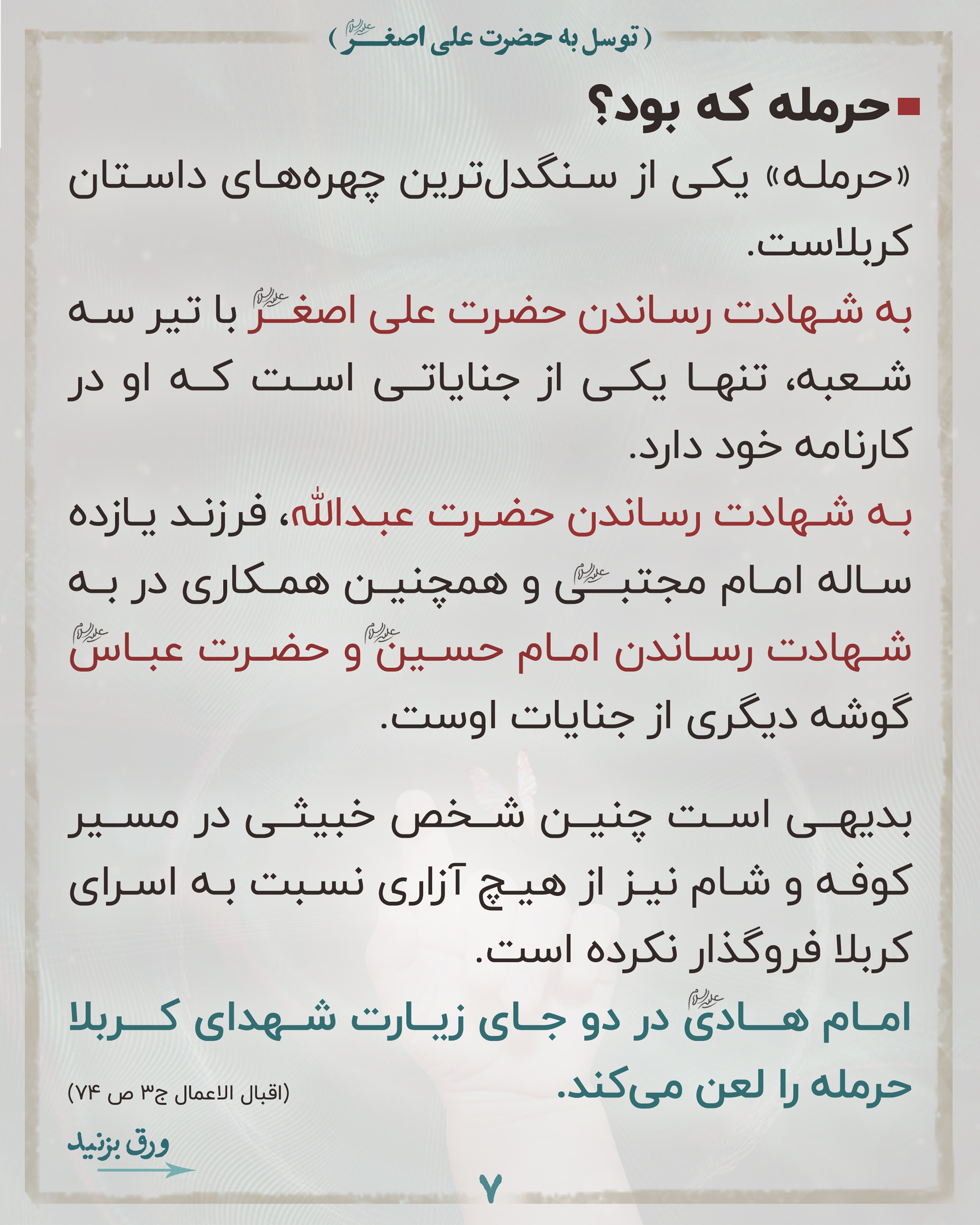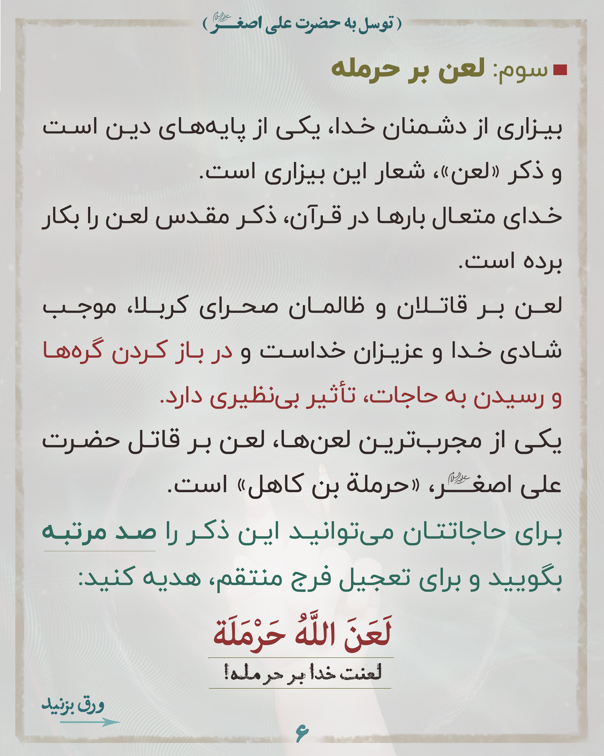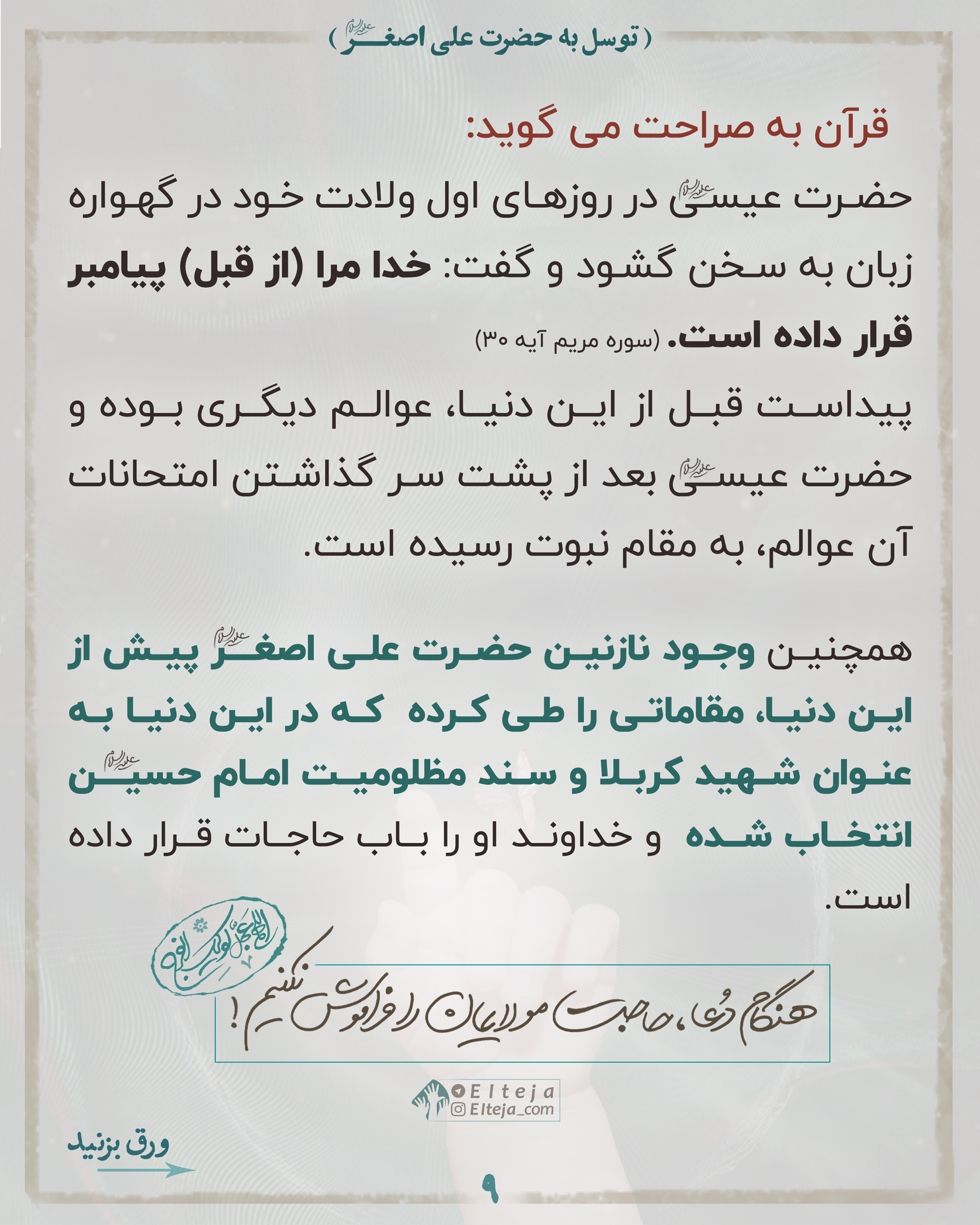 📌لذا بسیار بجاست وقتی برای فرج منتقم اهلبیت علیهم السلام دعا میکنیم خدا را به خون مظلوم قسم بدهیم و حضرت علی اصغر علیه السلام را واسطه کنیم.