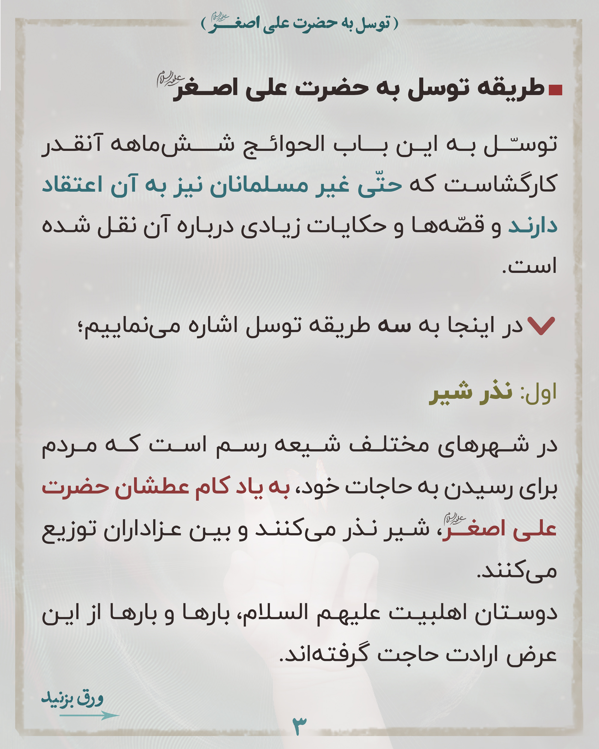 👈🏻یکی از راه های توسل به آن حضرت، قسم دادن خدا به خون مقدس اوست. طبق روایات امام حسین علیه السلام بعد از شهادت حضرت علی اصغر علیه السلام مشت خود را از خون مقدس نوزادش پر کرد و به آسمان پاشید و حتی یک قطره از آن خون به زمین نرسید! (📚اللهوف ص117)